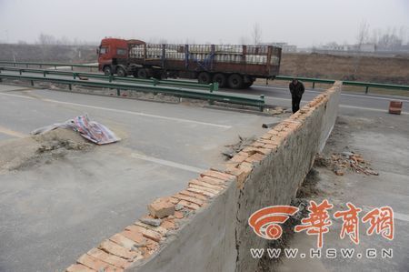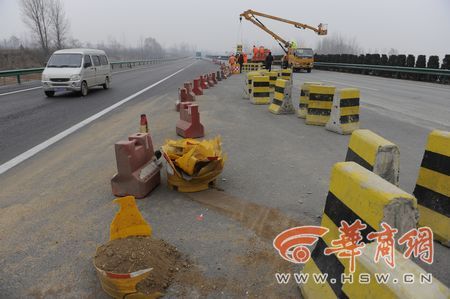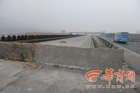 昨日上午,記者乘車從藍(lán)田東收費(fèi)站進(jìn)入滬陜高速前往西安方向,沒走多遠(yuǎn)就看到一溜塑料隔離墩引導(dǎo)著車輛向右行駛。隔離區(qū)域內(nèi),十余名工人正在吊裝安放水泥隔離墩,而高速路的正前方,則是用磚塊砌起來一堵墻,橫跨整個路面,整個墻上沒有任何交通標(biāo)識。鄒鐵琴指著已經(jīng)被抹上一層水泥的墻體說:“這就是我們那天撞上去的,這是剛剛補(bǔ)上的!庇浾吣繙y了一下,墻的高度在1.2米左右。一現(xiàn)場指揮的工作人員稱,被墻堵住的路是西商二線,由于工程沒有完工,所以將道路堵住。